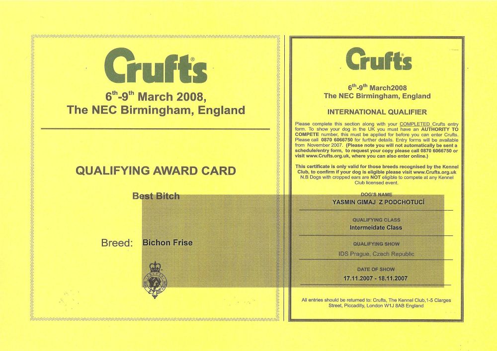 celého těla, tmavých drápků. Plně odpovídající standardu. Plnochrupá. Velmi pěkná fena.
