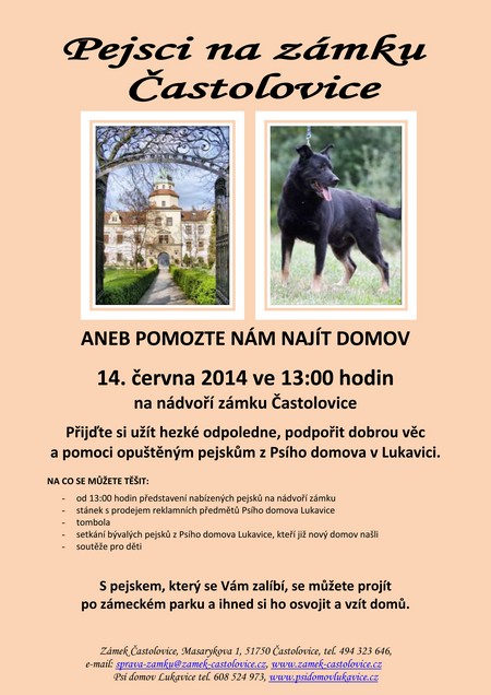 Navštivte 14. června  zámek v Častolovicích a podpořte opuštěné pejsky z Psího domova v Lukavicích.