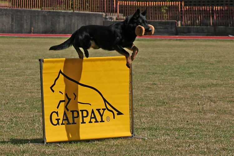 Popis: Aika vom Schwarzen-Kessel na aportu skokem. Překus při tomto cviku znamenal jedinou znatelnou ztrátu při jinak exelentní poslušnosti - 96 bodů... |