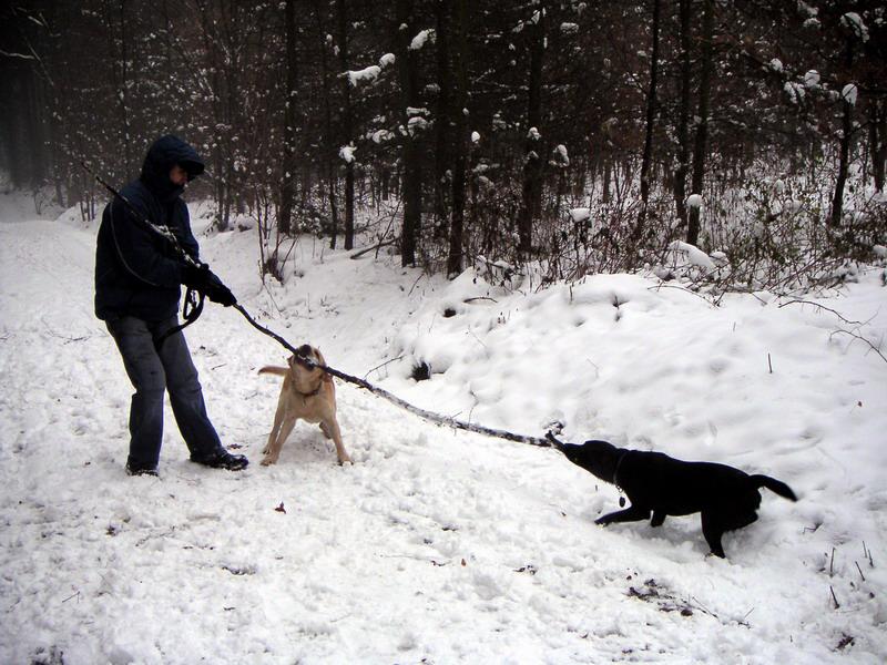 Skvělej klacek,skvělej páníček a skvělí psi.(první zimní hrátky hafíků)Prostě kluci v akci :-)